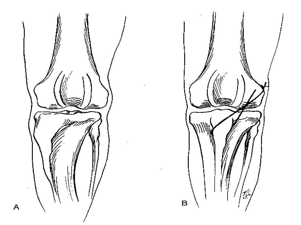 Цікавою у сенсі нормалізації біомеханічної вісі суглоба є застосування антиротаційного шва, що виправляє внутрішню торсію гомілки як показано на малюнку 5.