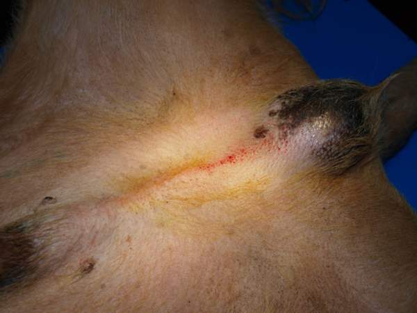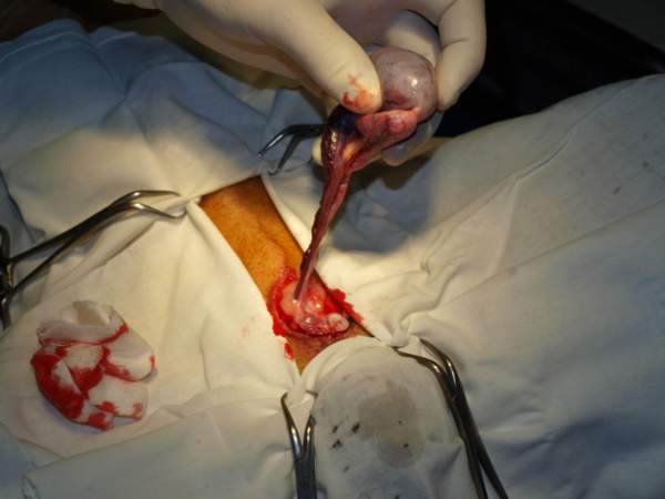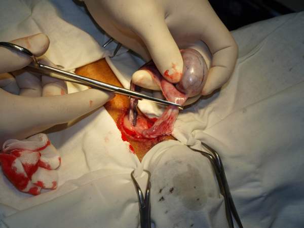 В последнее время мы используем технику кастрации по срединной линии избегая разрезания мошонки. Этот способ практически исключает сильный отёк мошонки и подтекание с операционной раны, которое бывает при проведении кастрации через разрез мошонки.
