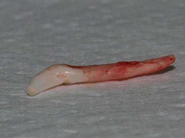 Обычно на верхней челюсти молочный клык располагается позади постоянного, как на этом снимке, и зачастую не мешают формированию нормального прикуса. Поэтому с удалением зуба на верхней челюсти можно повременить до 7-8 месяцев у мелких пород и до 6 месяцев у собак крупных пород. Вероятно, что лучше удалять клык полностью, но следует отметить (из личного опыта), что оставшийся корень на верхней челюсти при случайном обламывании клыка не вызывает никаких проблем в будущем .