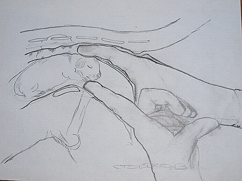 Надаючи допомогу при родах я знайшов відповідь на питання: «куди подіти другу руку?» Виявляється, що вказівний палець правої руки введений в пряму кишку може дістатися практично до шиї цуценяти. Вказівним пальцем лівої руки, введеним у вагіну, підтримуйте нижню щелепу цуценяти. Якщо пальцем лівої руки можна дістатись до нижньої щелепи, то таким чином можна витягнути практично будь-який плід. Спробуйте і переконайтесь. Звичайно це повинен робити спеціаліст у стерильних рукавичках.
